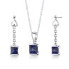 Earrings = Lab Created Sapphire, 2 pieces, Princess cut, 5.00mm. Earring Dimensions: 1 x 1/4 inches. Pendant = Lab Created Sapphire, 1 piece, Princess cut, 6.00mm. Pendant Dimensions: 5/8 x 1/4 inches. Earrings and Pendant have a total weight of 3.00 grams and are set in pure Sterling Silver with .925 stamp. Gemstones have a vibrant rich color and eye clean clarity. The Pendant and Earrings feature top quality workmanship and a beautiful finish.