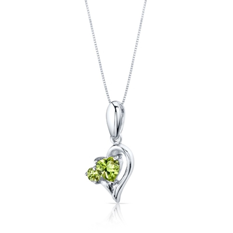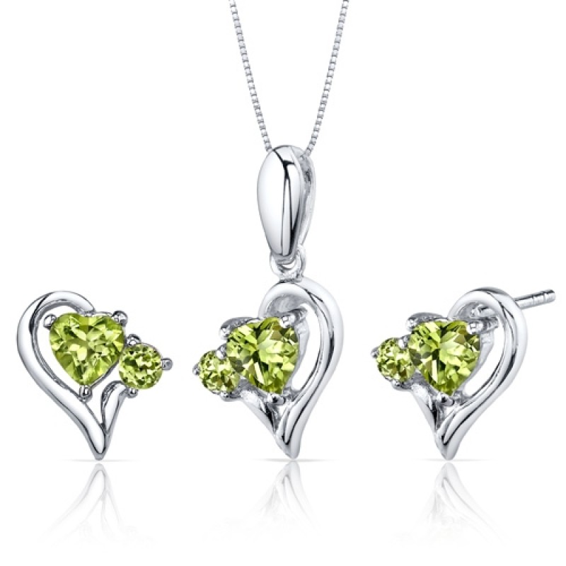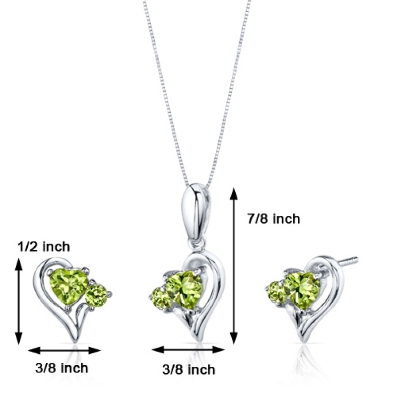 Gemstones: Genuine Peridot, Heart Shape, 2.25 carats total gem weight, Leaf Green Hue, Brilliant Sparkle and Clean Clarity. Pendant and Earrings are made from pure .925 Sterling Silver with a total metal weight of 3.40 grams. The set features top quality craftsmanship with Rhodium finishing. . Perfect gift for Christmas, Mothers Day, Valentines Day, Birthday, Graduation, Bridesmaids Jewelry.